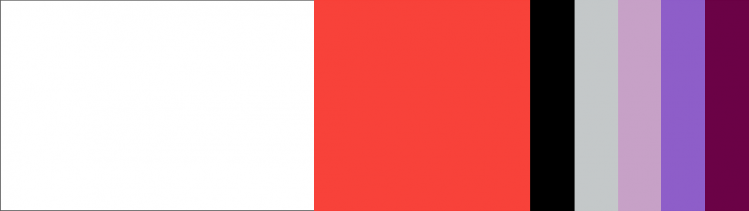šiltai raudoną #f8423a (R:249 G:66 B:58 / C:0 M:88 Y:80 K:0 / Pantone Warm Red C) ir juodą #000000 (R:0 G:0 B:0 / C:75 M:68 Y:67 K:90 / Pantone Black 6C).
