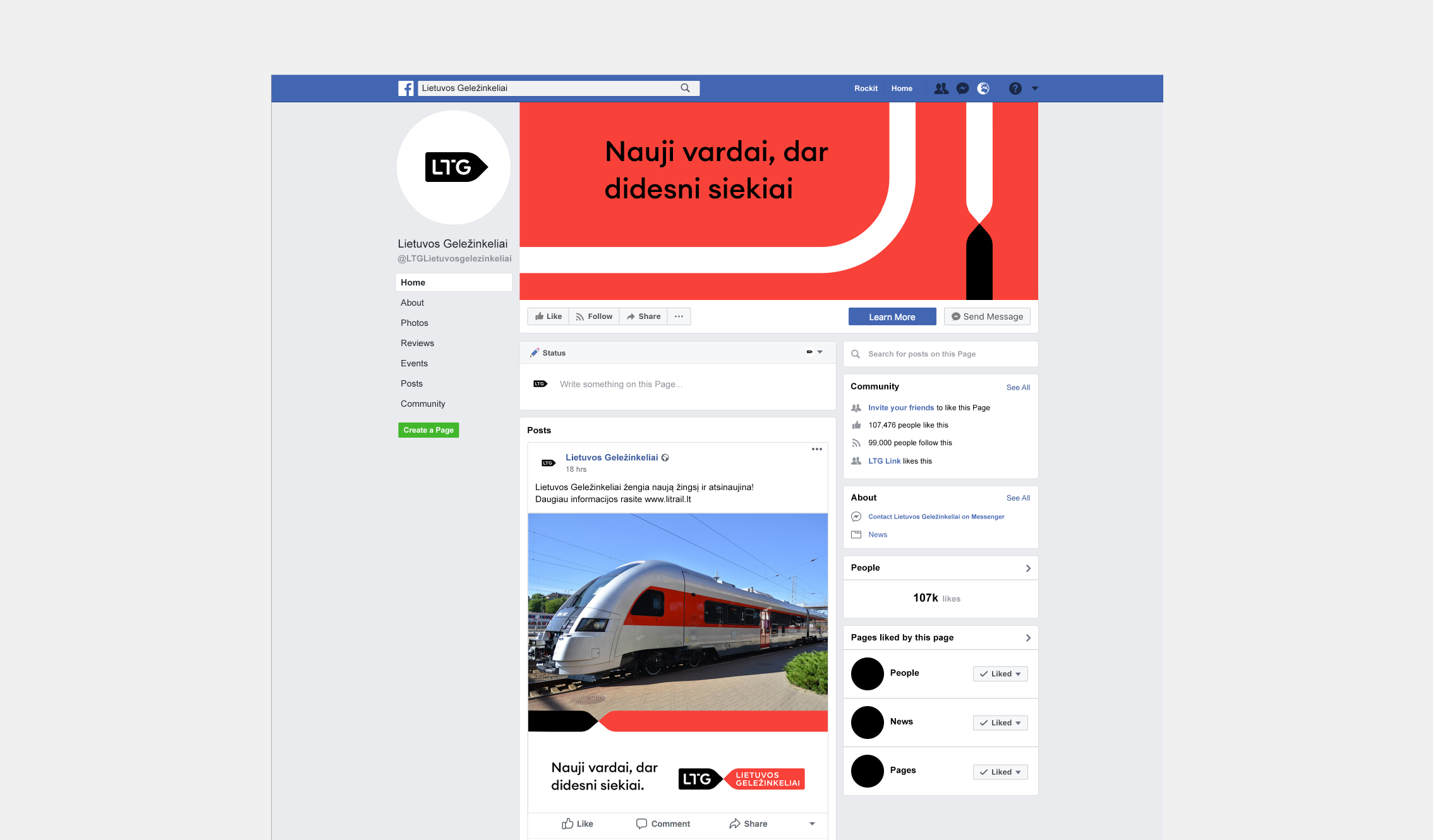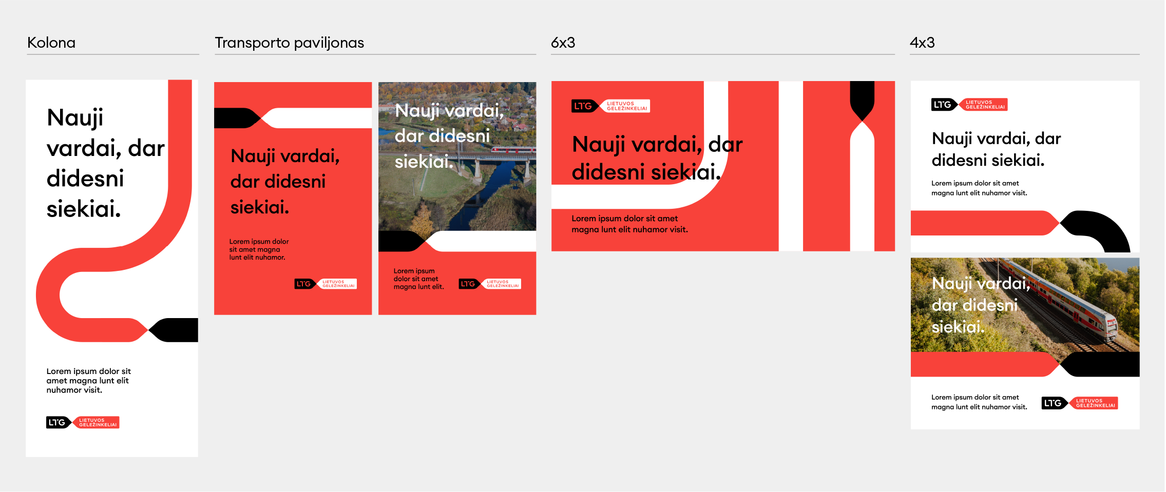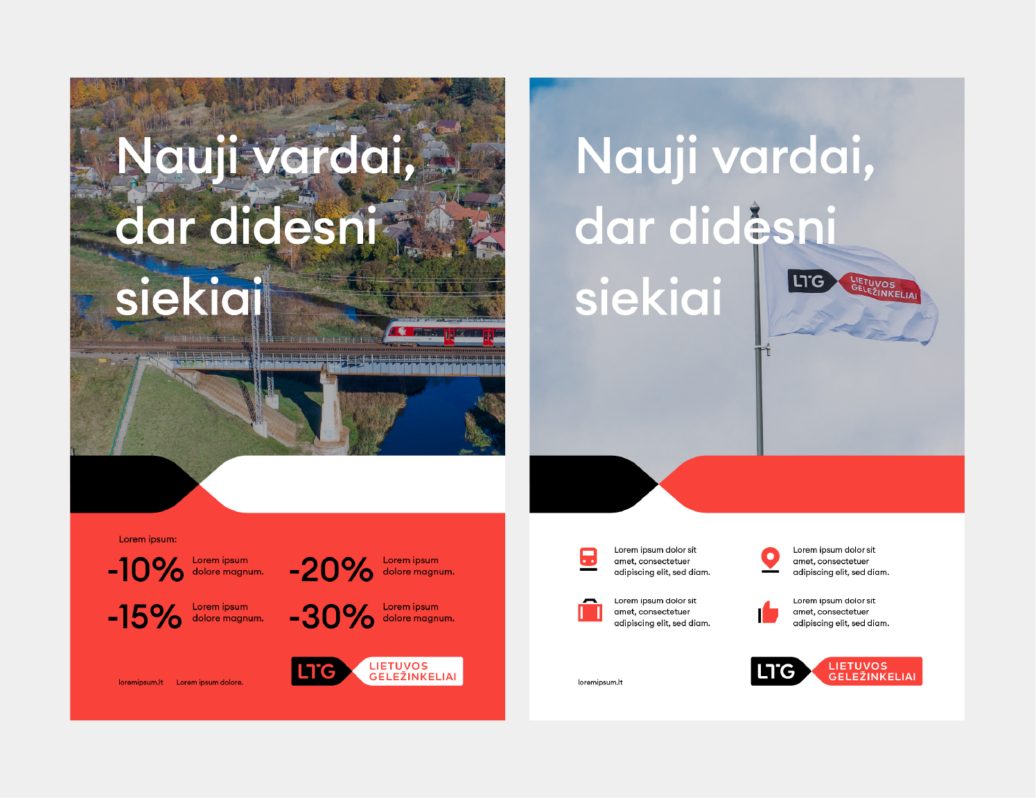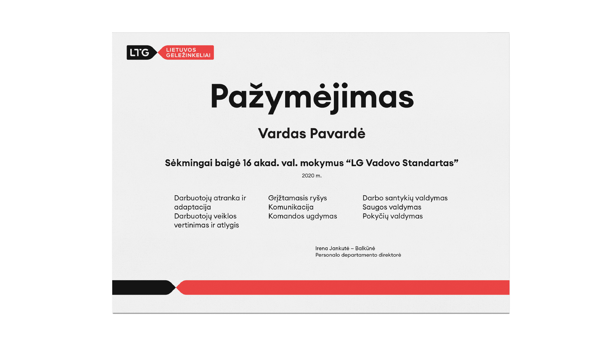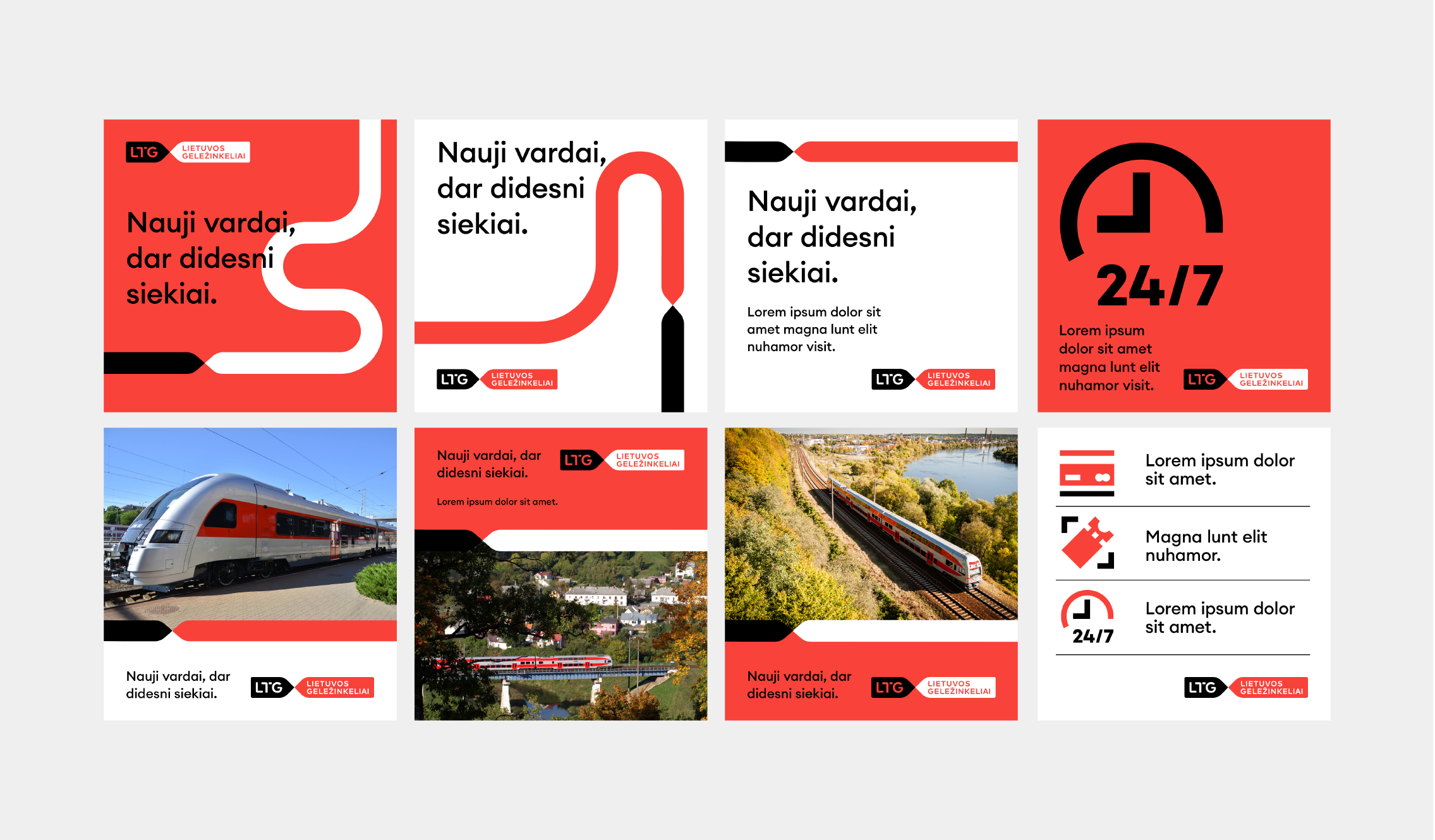 Tai pažadas kurti tvarią Lietuvos ateitį, suteikiant galimybę žmonėms ir kroviniams judėti švariau, efektyviau ir pažangiau. „Lietuvos geležinkeliai“ yra toliaregiški, iniciatyvūs ir atsakingi, pasižymintys veiklos meistryste. Tai prekės ženklas, kurį išskiria siekis suteikti kuo daugiau naudos Lietuvai, dirbti galvojantiems apie ateitį ir visiems ją kuriantiems. Siekis keisti, tobulėti, pranokti save, pasiekti daugiau vienija ir visus kitus grupės prekės ženklus. „LTG Link“, keleivių vežimo prekės ženklas, siekia važiavimą paversti kelione sklandžia, malonia ir draugiška aplinkai. „LTG Cargo“, krovinių vežimo prekės ženklo, ambicija – gerus krovinių vežimo sprendimus paversti dar geresniais. „LTG Infra“, infrastruktūros prekės ženklas, savo esmę išreiškia fraze „naujos idėjos sklandžiam judėjimui.“ Daugiau informacijos apie kiekvieną grupės prekės ženklą – atskiruose šių prekės ženklų vadovuose.