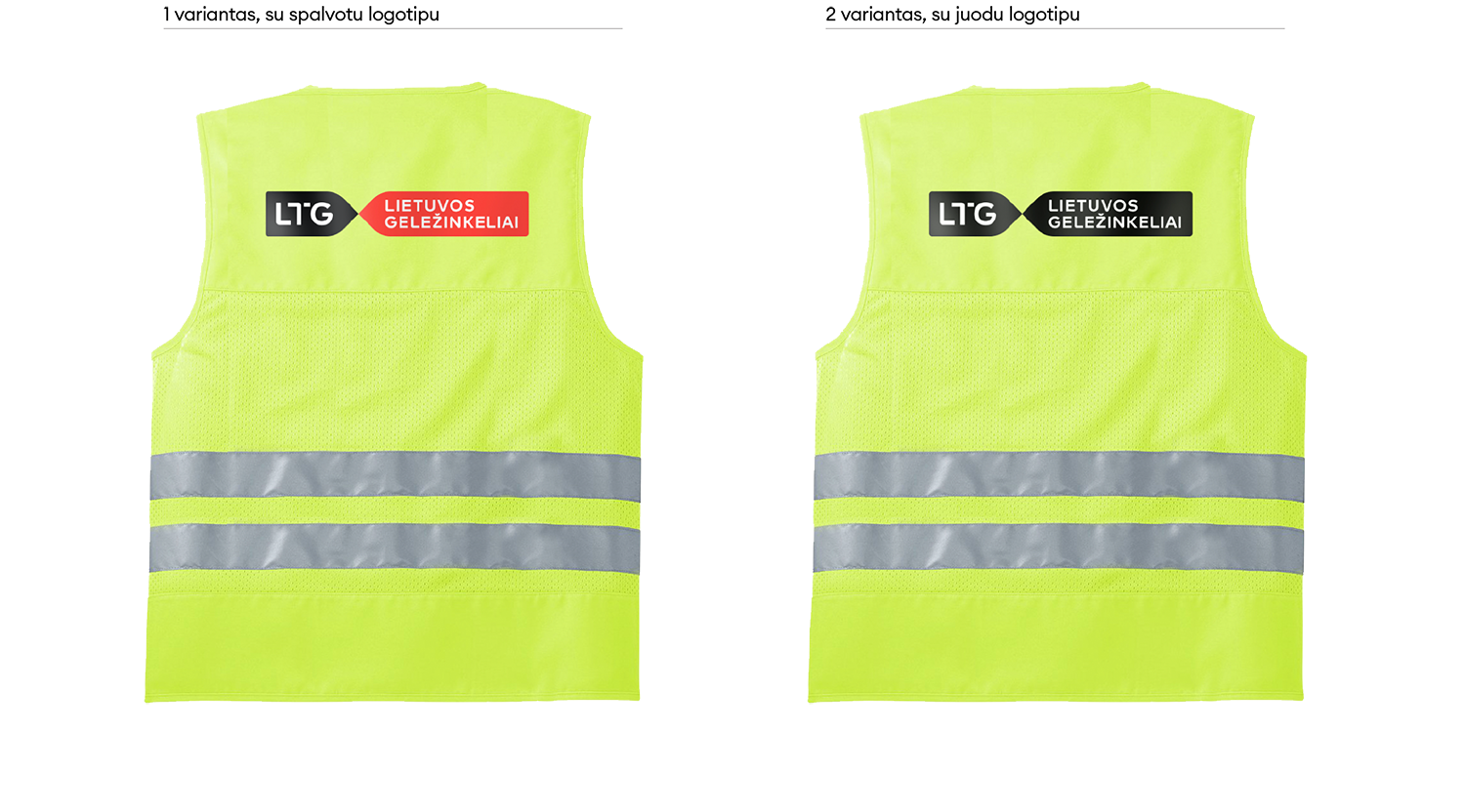 „Lietuvos geležinkelių“  logotipas turi keletą skirtingų versijų. Visada naudojame pagrindinę, spalvotą, logotipo versiją. Ant spalvoto fono – pagrindinę juodai baltą arba juodą ženklo versiją. Jei dėl spaudos apribojimų ar kitų priežasčių nėra galimybės rinktis šių versijų, galime naudoti linijinę arba versiją su užpildytomis logotipo raidėmis.
