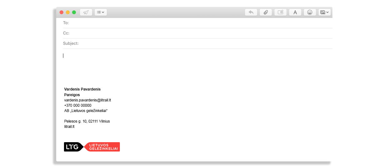 Žemiau pateikiamas el.parašo dizaino pavyzdys, prieš naudojimą rekomenduojame peržiūrėti ir atnaujinti rekvizitus bei kitą asmeninę ar juridinę informaciją. Vardui, pavardei bei pareigoms/padaliniui užrašyti naudojame 11 pt dydžio „Arial“ šriftą, „Bold“ versiją. Likusiems rekvizitams naudojame 11 pt dydžio „Arial“ šriftą, „Regular“ versiją.