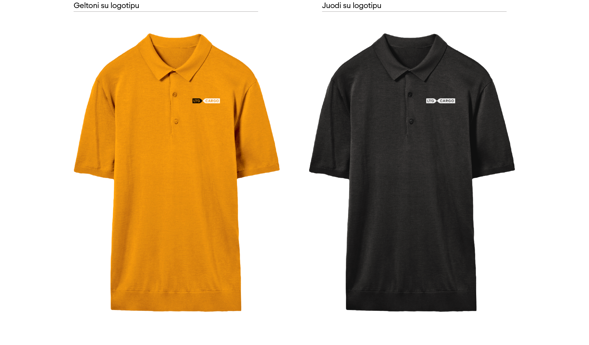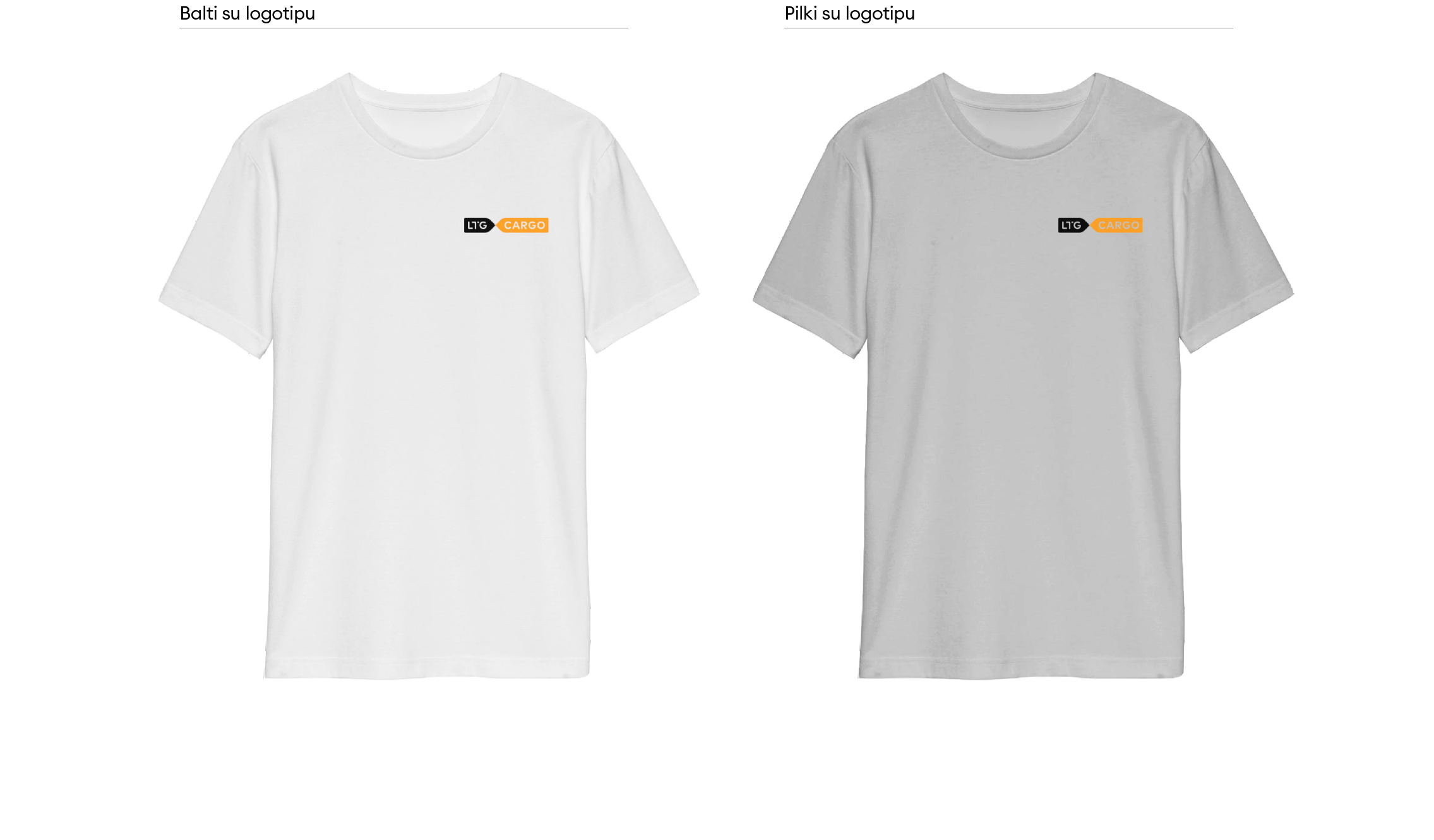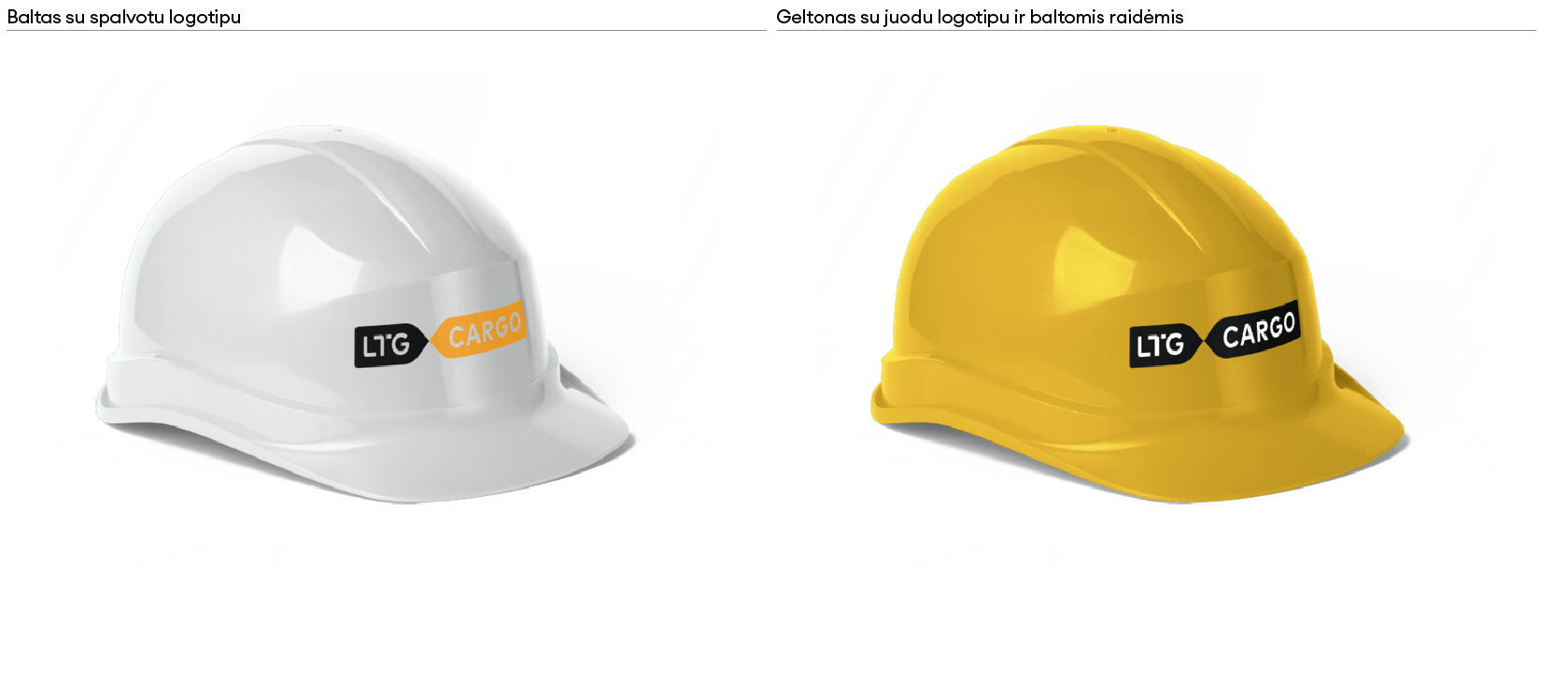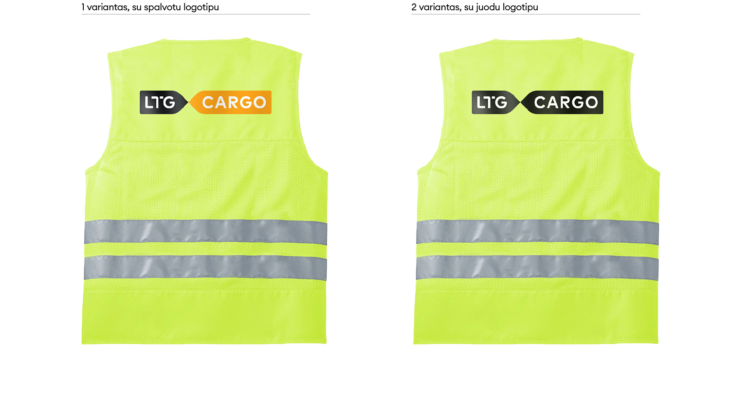 „LTG Cargo“ logotipas turi keletą skirtingų versijų. Visada naudojame pagrindinę, spalvotą, logotipo versiją. Ant spalvoto fono – pagrindinę juodai baltą arba juodą ženklo versiją. Jei dėl spaudos apribojimų ar kitų priežasčių nėra galimybės rinktis šių versijų, galime naudoti linijinę arba versiją su užpildytomis logotipo raidėmis.
