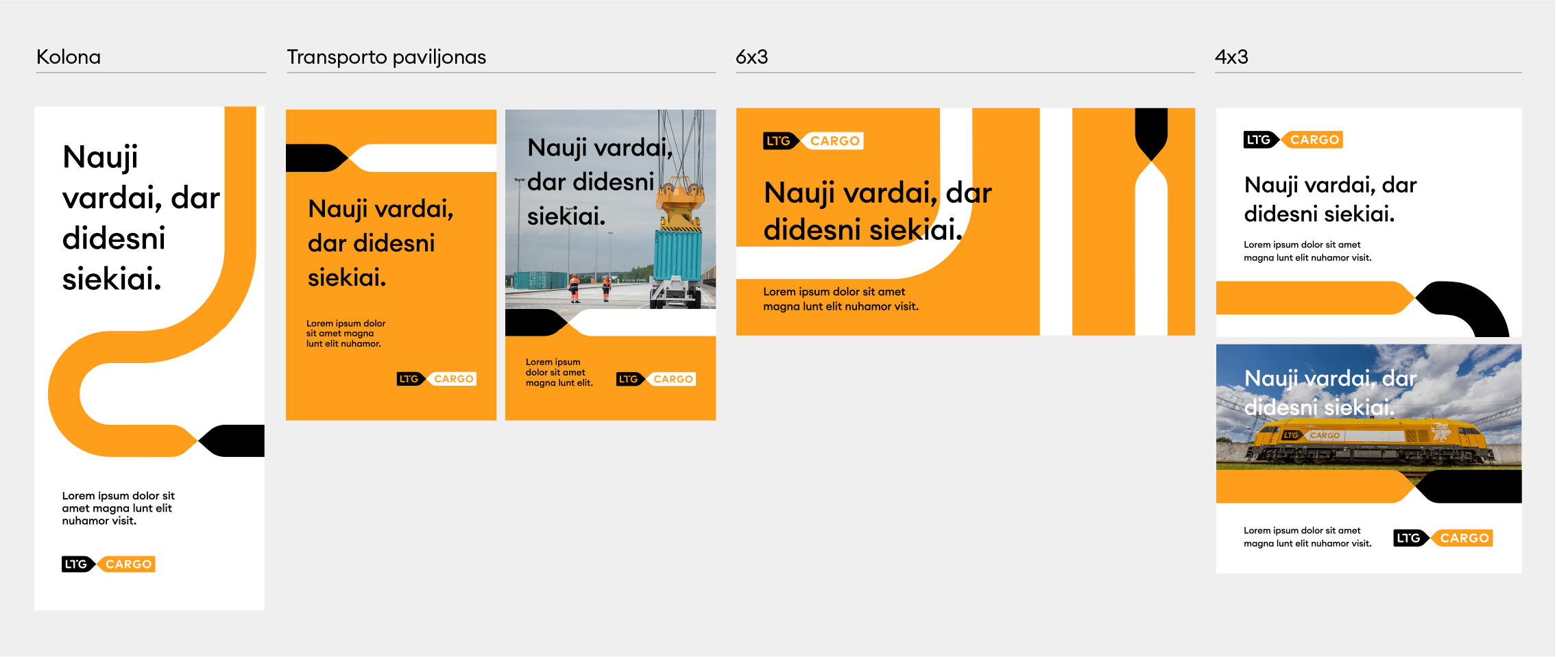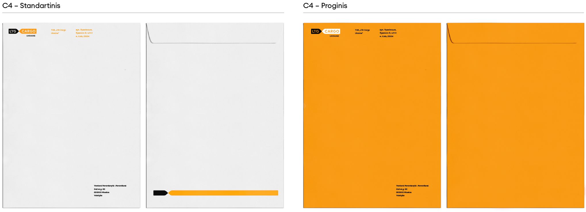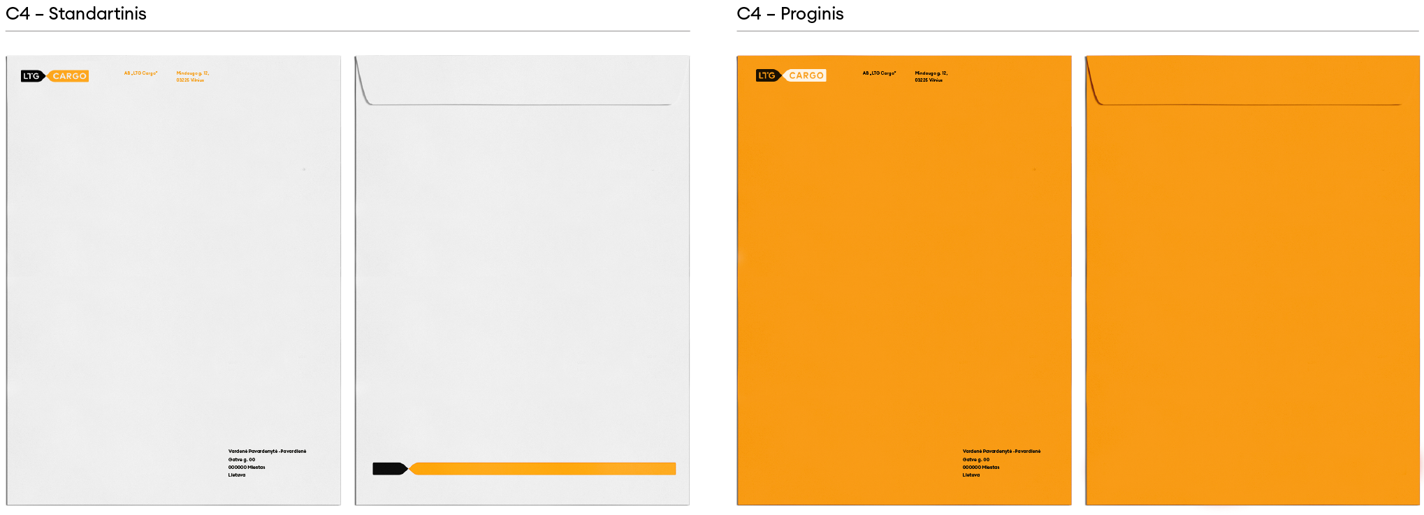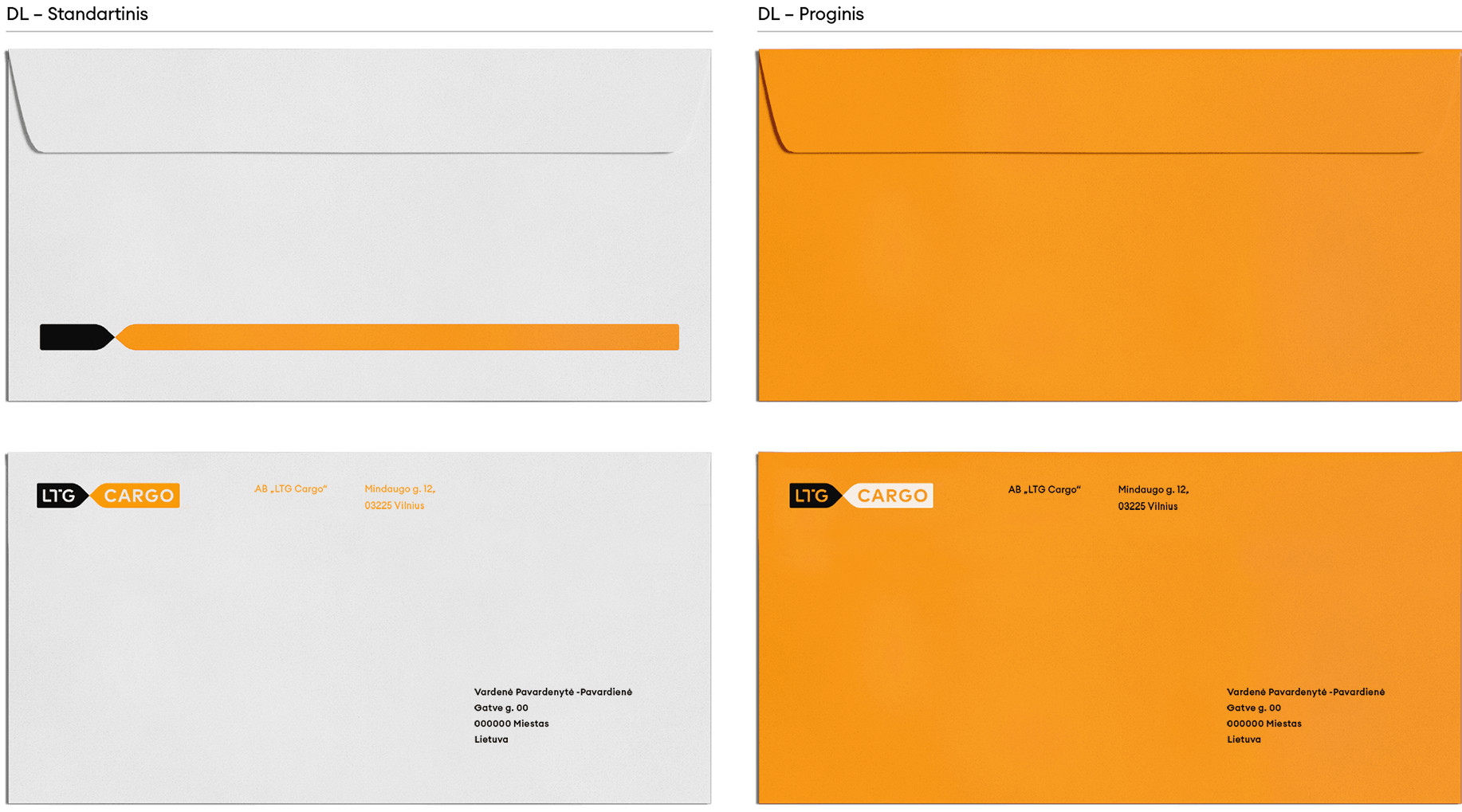 „LTG Cargo“ logotipas turi keletą skirtingų versijų. Visada naudojame pagrindinę, spalvotą, logotipo versiją. Ant spalvoto fono – pagrindinę juodai baltą arba juodą ženklo versiją. Jei dėl spaudos apribojimų ar kitų priežasčių nėra galimybės rinktis šių versijų, galime naudoti linijinę arba versiją su užpildytomis logotipo raidėmis.