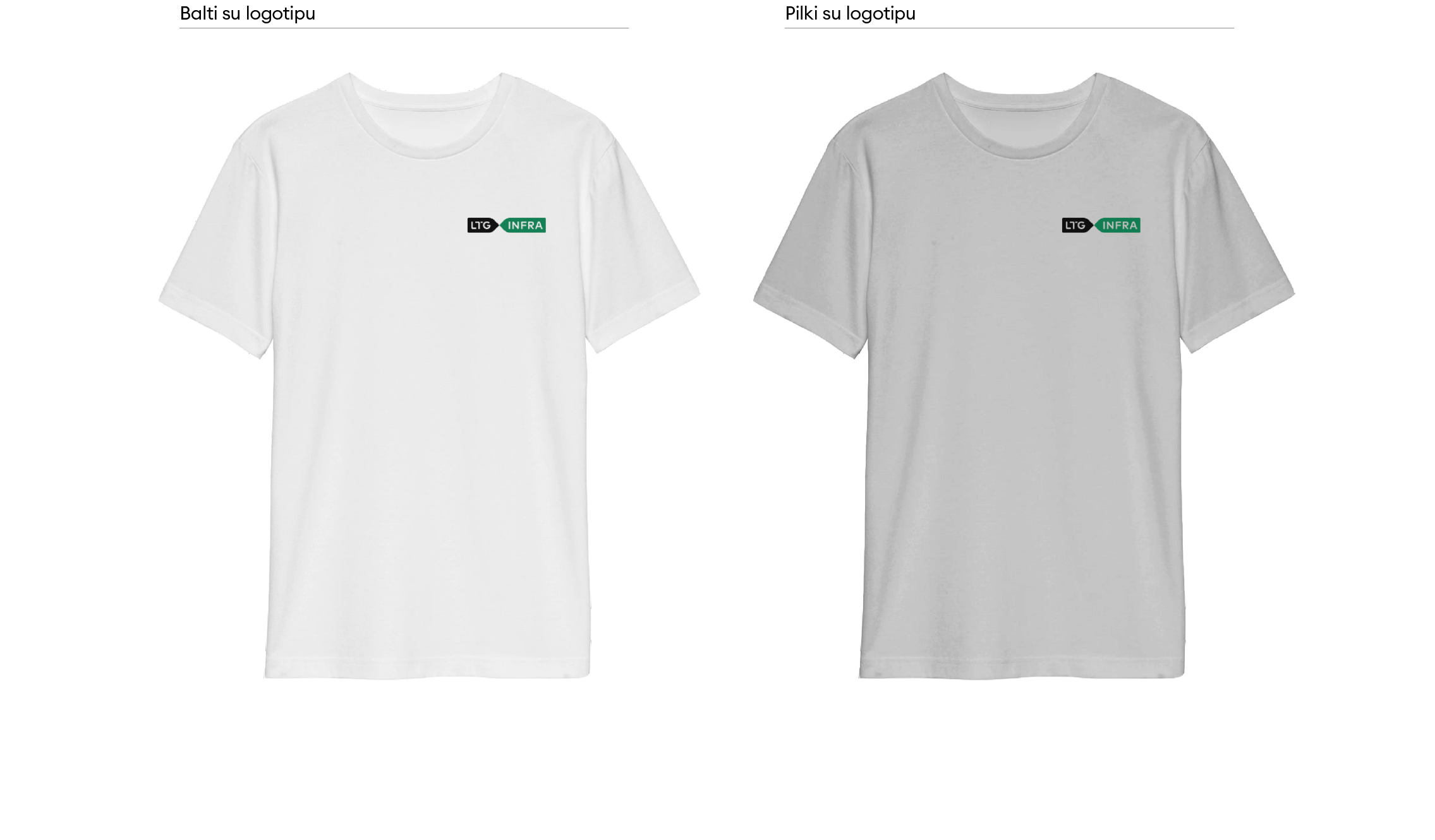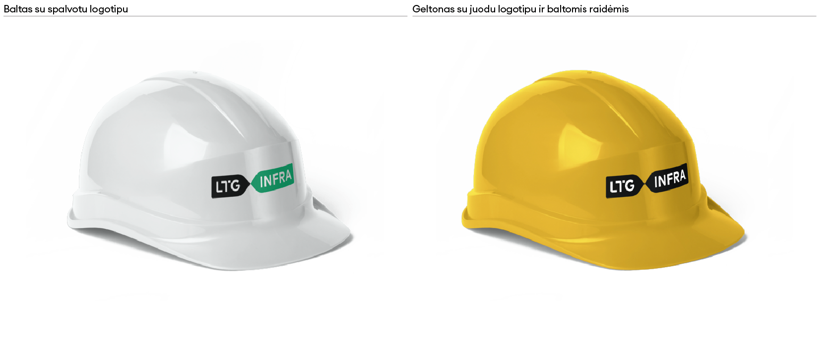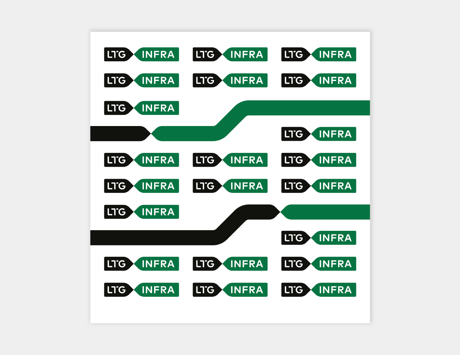 „LTG Infra“ logotipas turi keletą skirtingų versijų. Visada naudojame pagrindinę, spalvotą, logotipo versiją. Ant spalvoto fono – pagrindinę juodai baltą arba juodą ženklo versiją. Jei dėl spaudos apribojimų ar kitų priežasčių nėra galimybės rinktis šių versijų, galime naudoti linijinę arba versiją su užpildytomis logotipo raidėmis.