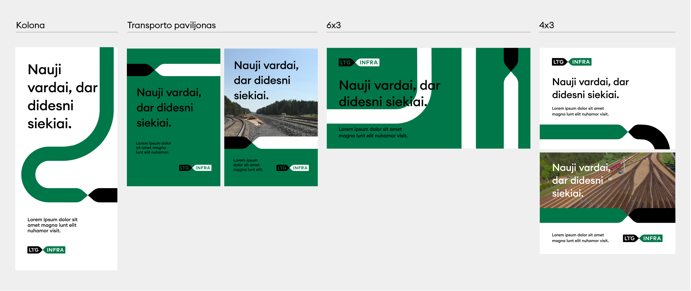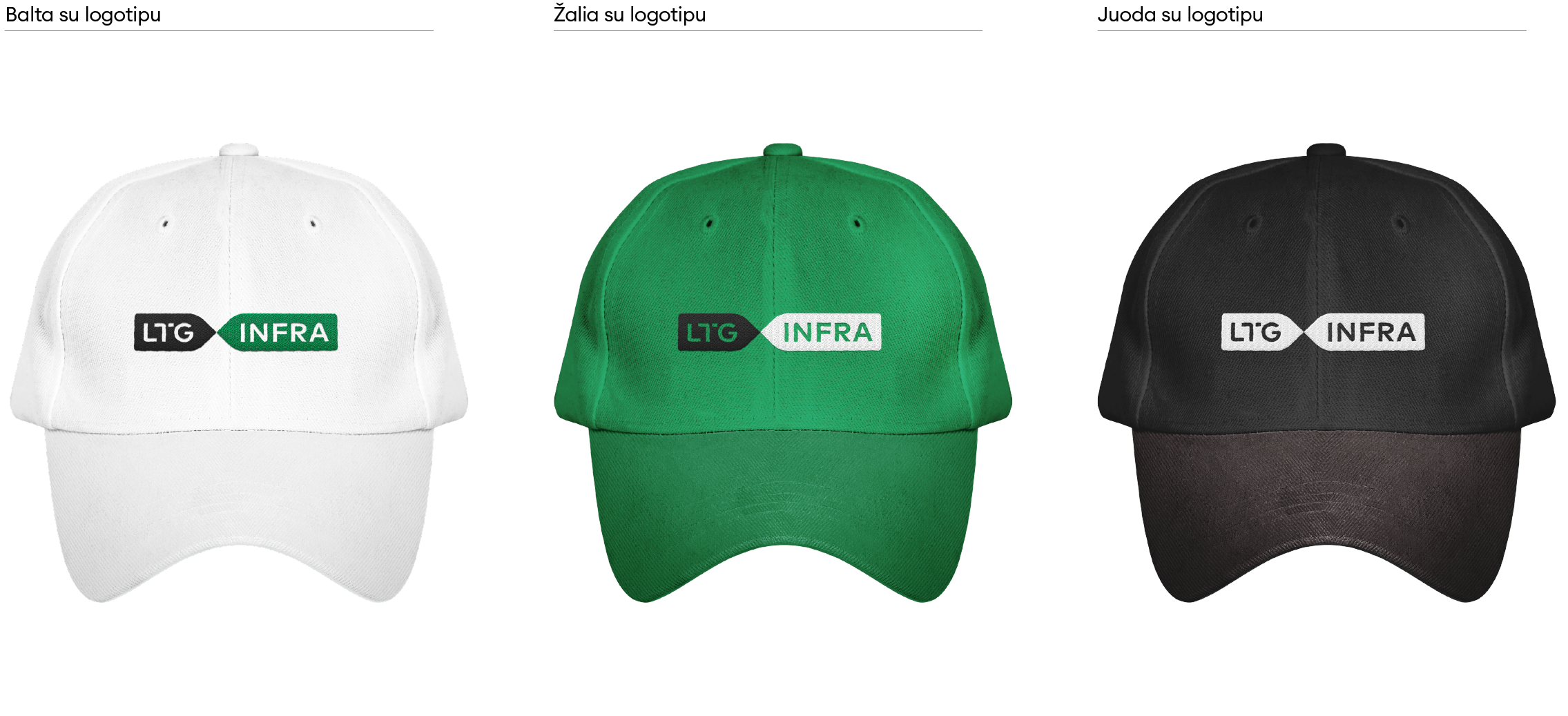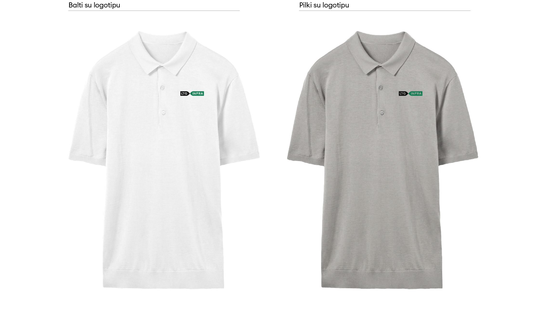 „LTG Infra“ logotipas turi keletą skirtingų versijų. Visada naudojame pagrindinę, spalvotą, logotipo versiją. Ant spalvoto fono – pagrindinę juodai baltą arba juodą ženklo versiją. Jei dėl spaudos apribojimų ar kitų priežasčių nėra galimybės rinktis šių versijų, galime naudoti linijinę arba versiją su užpildytomis logotipo raidėmis.