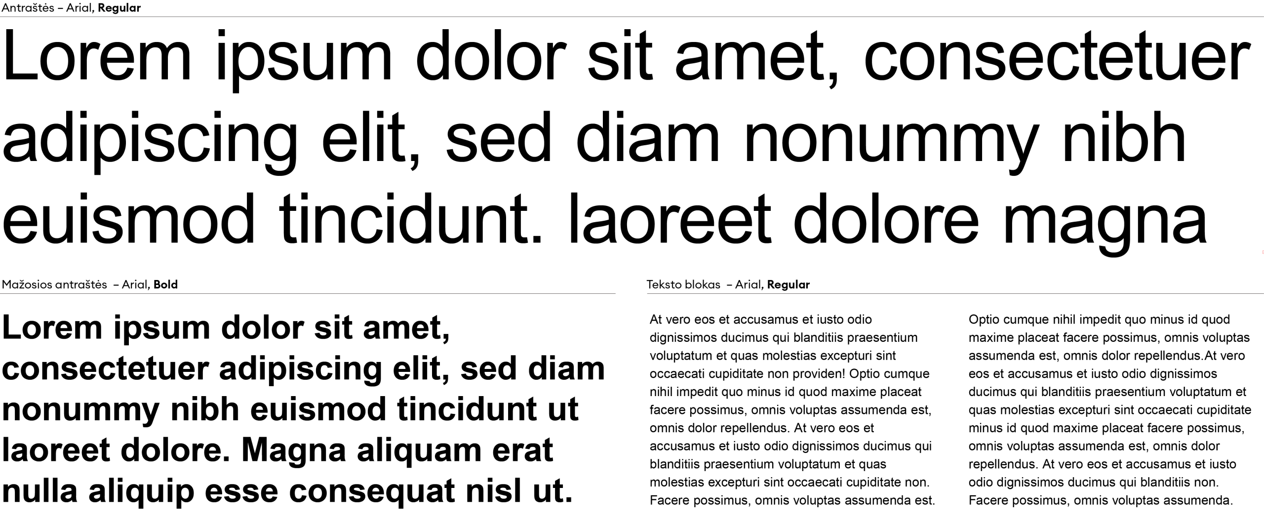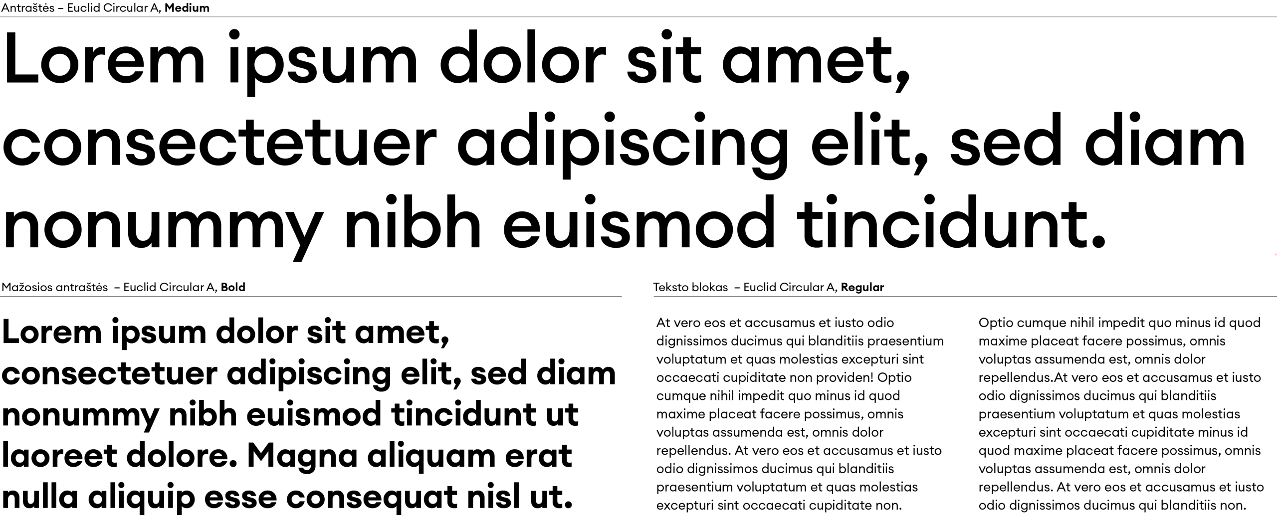 Mūsų pagrindinis šriftas yra „Euclid Circular A“. Jis naudojamas mūsų komunikacijoje, spaudoje ir kitose identiteto kūrimo priemonėse. Antraščių tekstui visada naudojame „Medium“ versiją. Mažosioms antraštėms – „Bold“ versiją. Teksto blokams ir paragrafams – „Regular“ versiją, informacijai paryškinti ar išskirti – „Bold“, „Italic“.