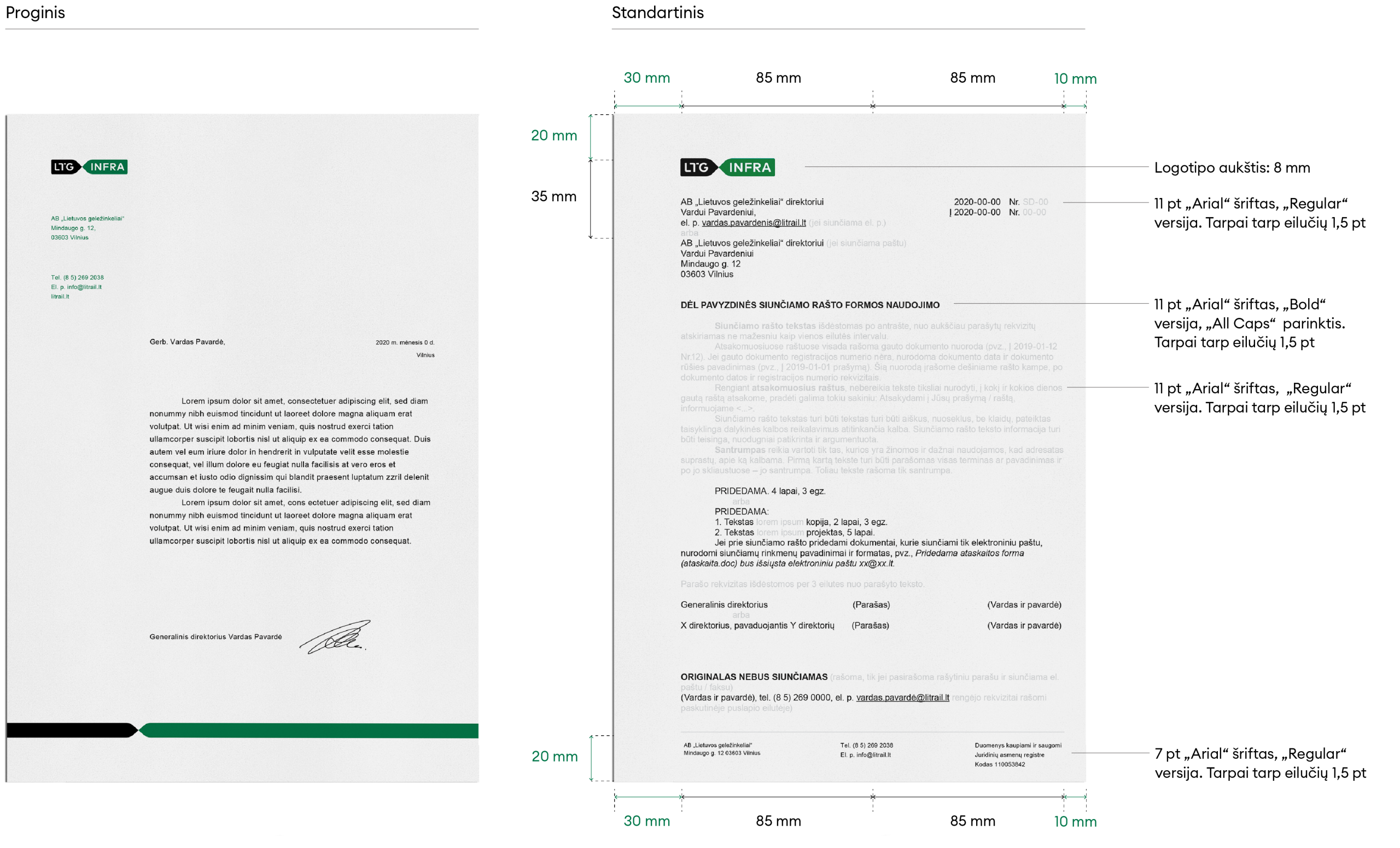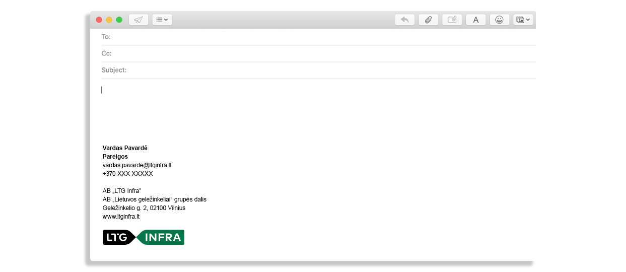 Žemiau pateikiamas el.parašo dizaino pavyzdys, prieš naudojimą rekomenduojame peržiūrėti ir atnaujinti rekvizitus bei kitą asmeninę ar juridinę informaciją. Vardui, pavardei bei pareigoms/padaliniui užrašyti naudojame 11 pt dydžio „Arial“ šriftą, „Bold“ versiją. Likusiems rekvizitams naudojame 11 pt dydžio „Arial“ šriftą, „Regular“ versiją.
