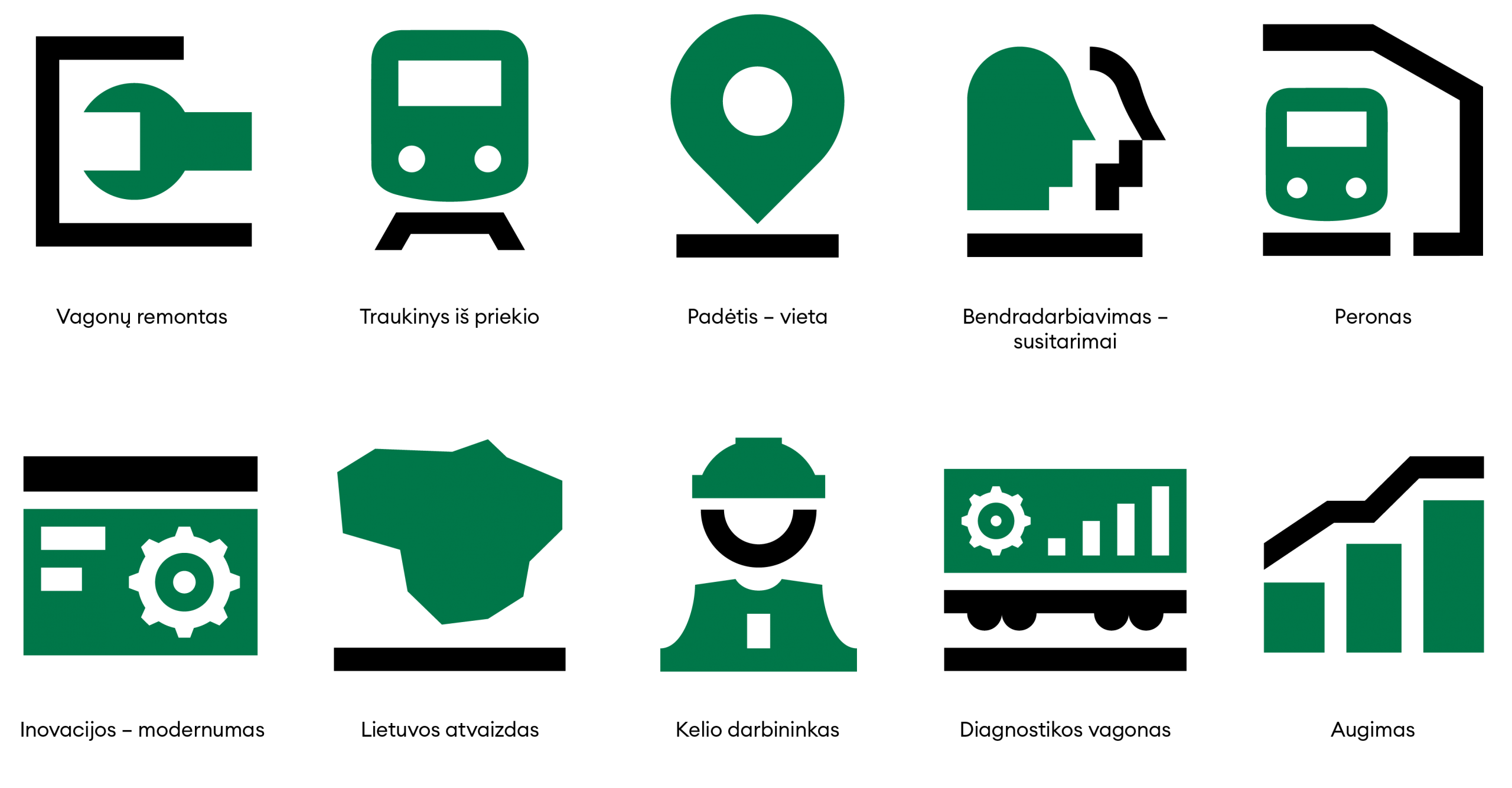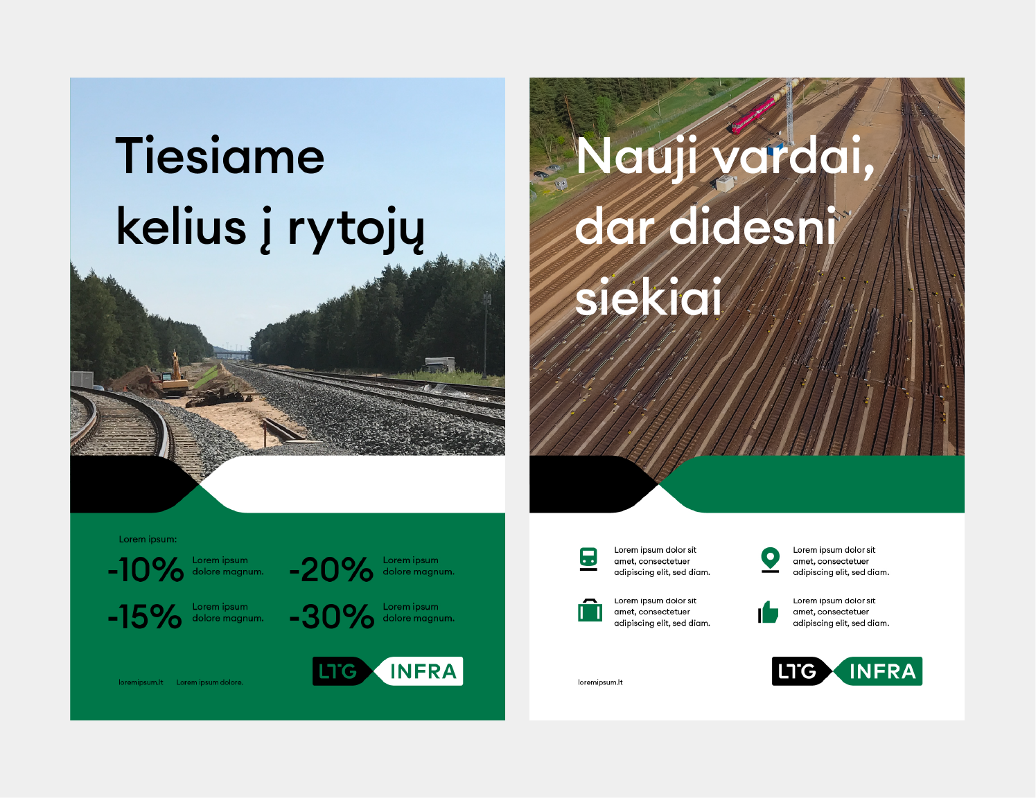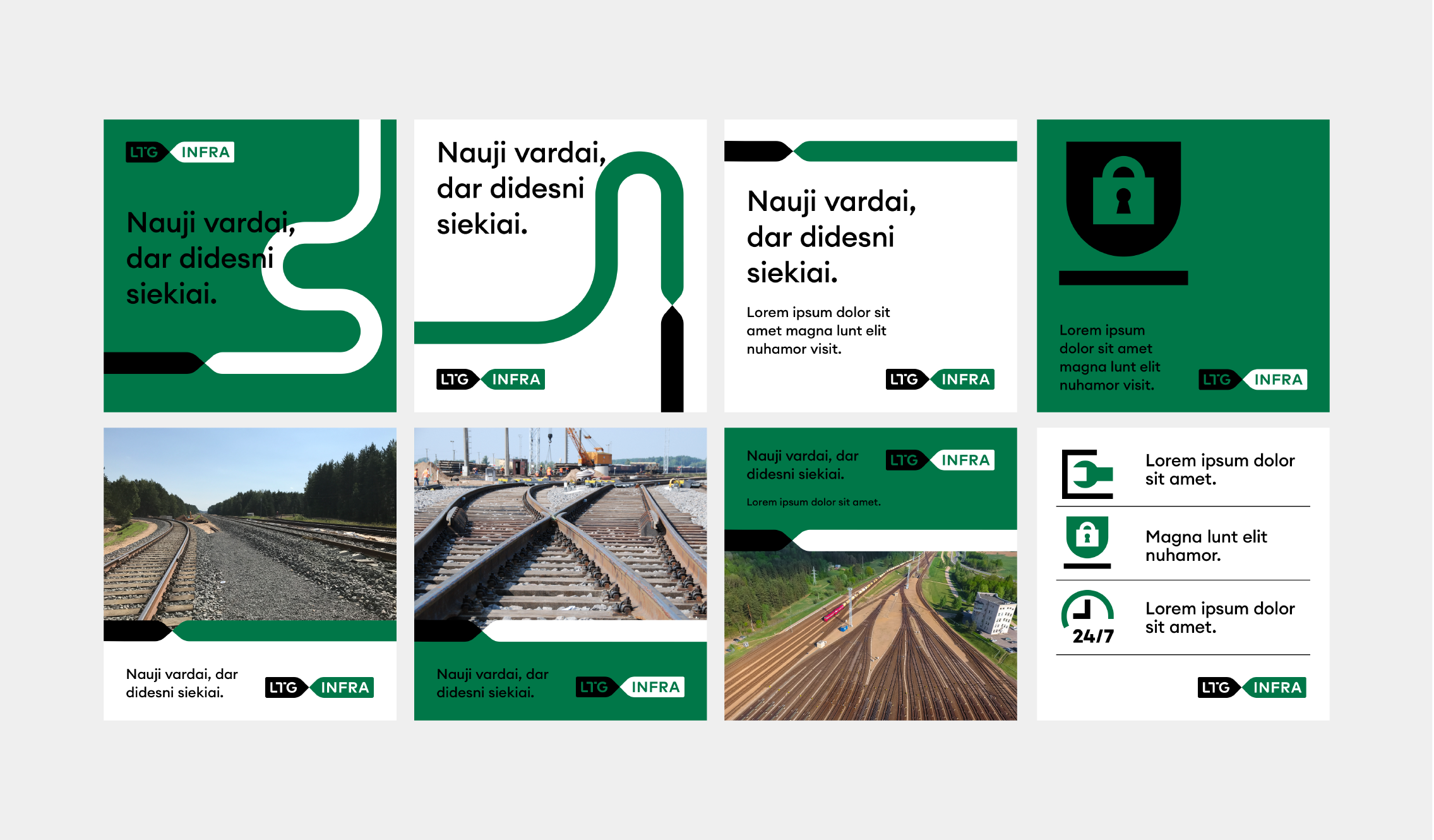Tai originalus „LTG Infra“ ikonografijos rinkinys, skirtas atskleisti identiteto stilių visose reikalingose priemonėse. Ikonų stilių diktuoja logotipe vaizduojama dviejų elementų jungtis. Visos ikonos sudarytos iš dviejų spalvų, esančių kiekvienos bendrovės logotipe. Ikonos apjungia liniją ir dėminį elementą.