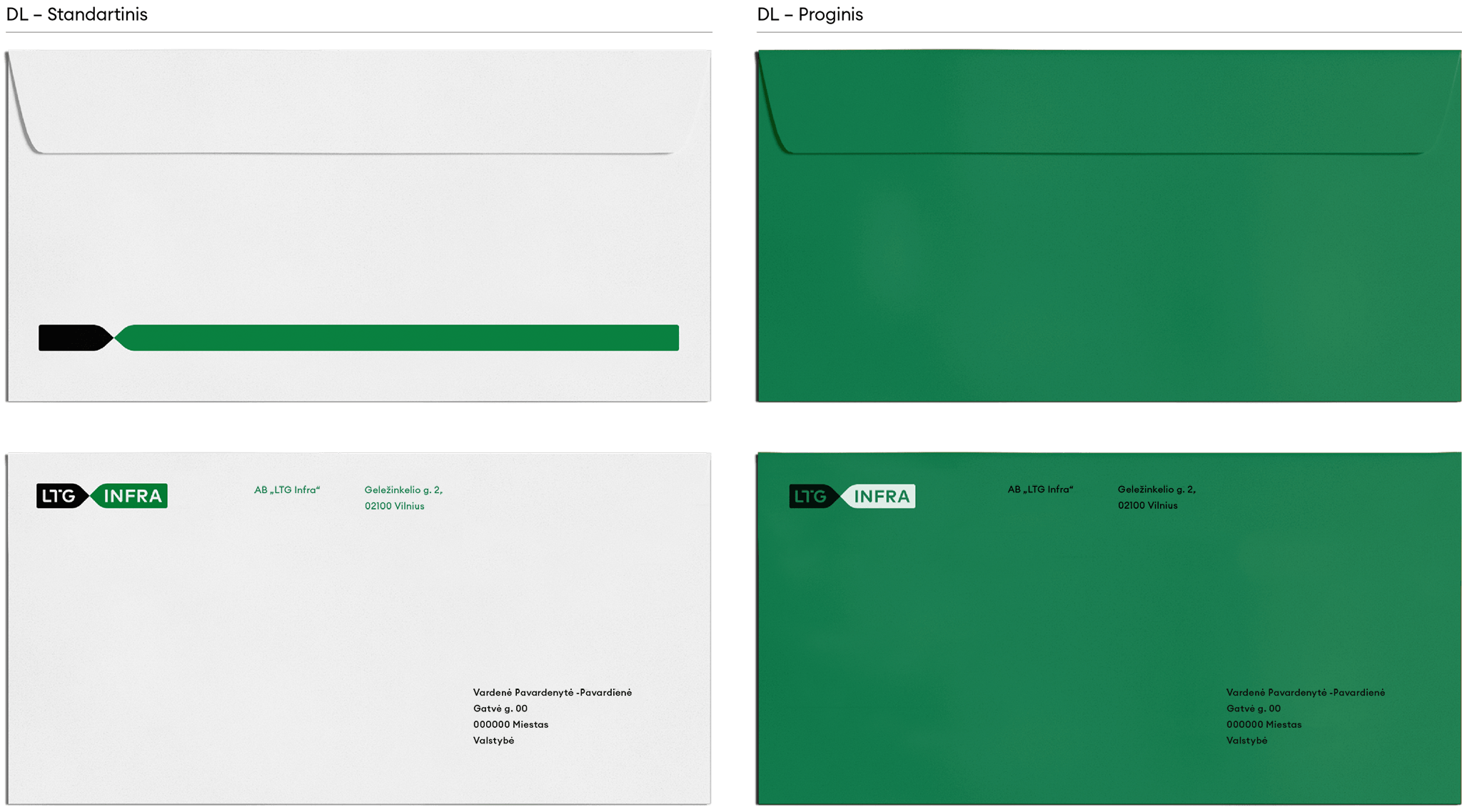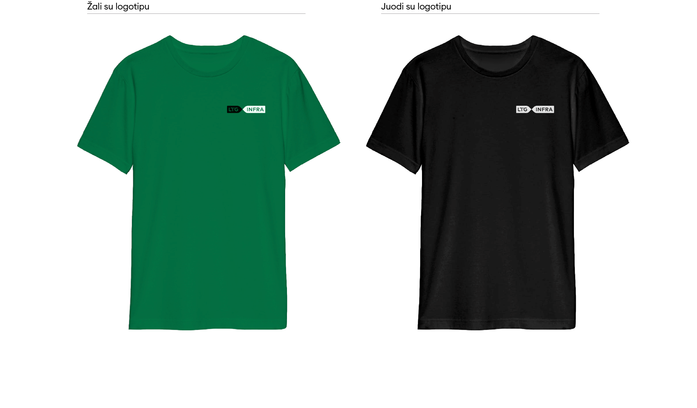 Kurdami vizualinį „LTG Infra“ identitetą, naudojame šias spalvas pagal numatytas jų proporcijas. Pagrindinė spalva yra sodriai žalia. Antrinės spalvos yra šešios: tamsiai žalia, ryškiai žalia, ryškiai geltona, juoda, pilka ir balta. Pagrindinės spalvos turėtų atsiskleisti išorinėse komunikacijos priemonėse (plakatuose, lankstinukuose, socialinių medijų paveikslėliuose ir kt.), t.y. bent 85% komunikacijos priemonių naudojimo, kad būtų sukurtas vizualinis atpažįstamumas.