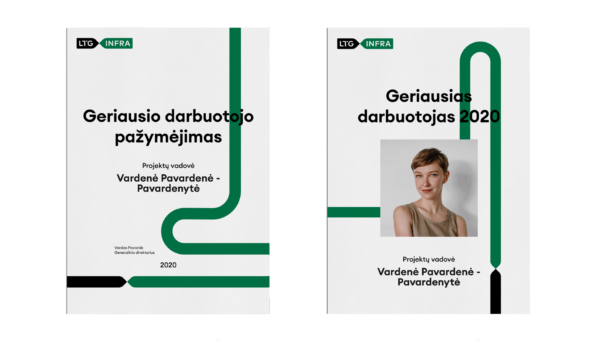 Grafinis elementas yra neatsiejama mūsų identiteto dalis. Tai pagrindinė priemonė, kurianti mūsų vizualiąją išraišką ir vientisą identitetą. Linija visais atvejais susideda iš dviejų spalvinių dalių: žalios ir juodos arba baltos ir juodos.