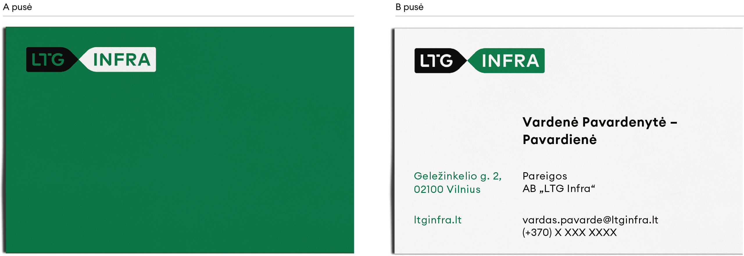 Žemiau pateikiamas vizitinės kortelės dizaino pavyzdys, prieš naudojimą rekomenduojame peržiūrėti ir atnaujinti rekvizitus bei kitą asmeninę ar juridinę informaciją.